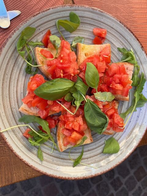 Bruschetta, complete with fresh tomatoes, basil and arugula.