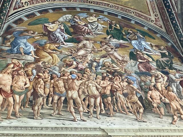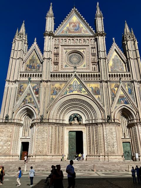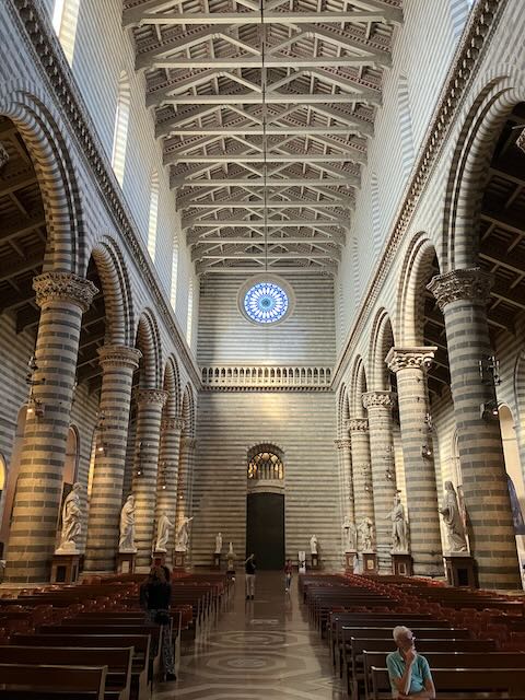We visited the Duomo (Cathedral of Santa Maria Assunta) and it is really beautiful. It was designed in the Romanesque style initially and construction began in 1290. The Gothic style was added several years later. In fact, a Sienese sculptor and architect named Lorenzo Maitani became the master of the construction. This building reminded us of the cathedral in Siena, also of the same name (Santa Maria Assunta) and type construction, although about one century older.