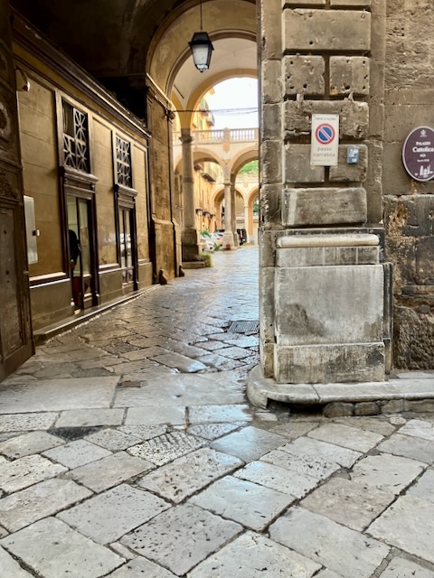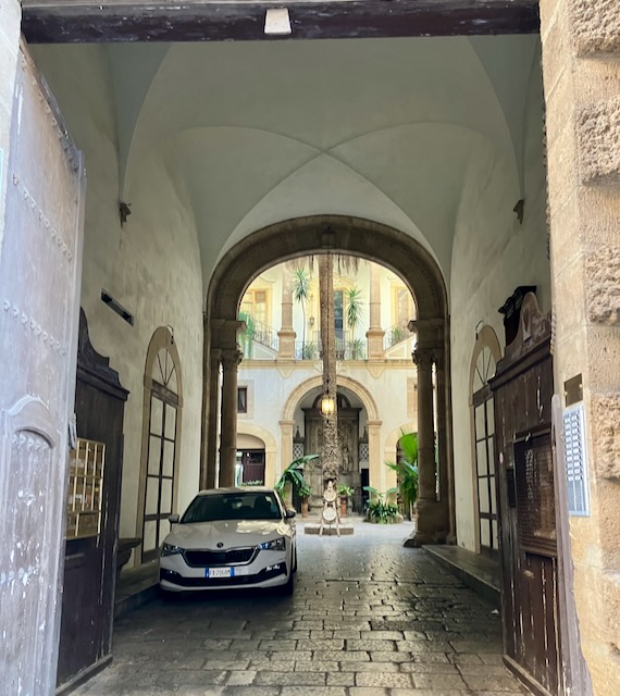 Recall how we mentioned that many of the large buildings here (and in other cities for that matter) are called palazzi or palaces. We also said they often have inner courtyards or quadrangles. Two we passed while walking here in Palermo had their big giant doors open so we snapped photos of their interiors. Remember, ground floor offices, spaces or apartments might include restaurants, shops, a lottery office, a drug store or the entrance to living apartments on the upper floors. Most have parking on the inside and off the street.