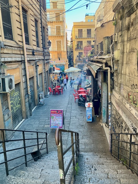 We passed this set of steps and outside cookery every day we went downtown. You see the smoke slightly obscuring your vision down Via Roma and then next get hit with the wonderful aroma of food being grilled and roasted. The area is Mercato Vucciria. These folk are out every day and their endeavors only add to the enticing atmosphere of Palermo.