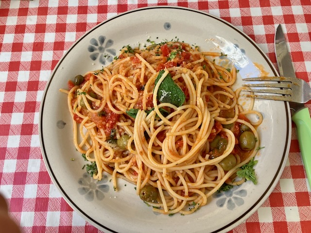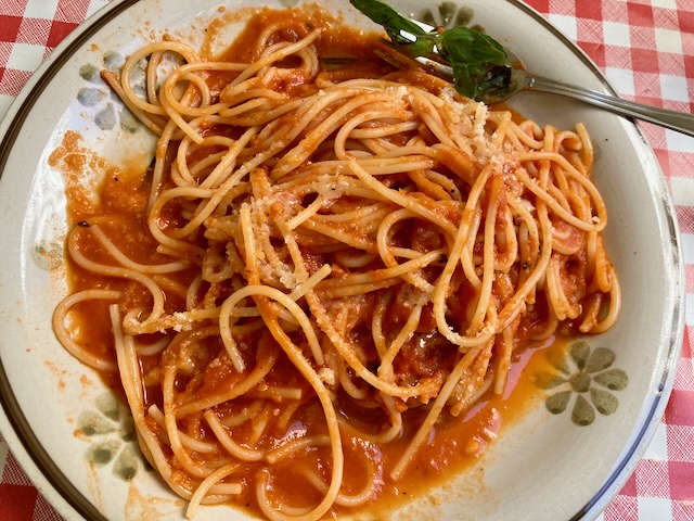 Fran’s spaghetti was al pomodoro, with tomato sauce.