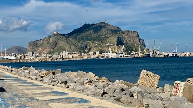 The bay and port with Mount Pellegrino where Saint Rosalia’s grotto is located in the background.