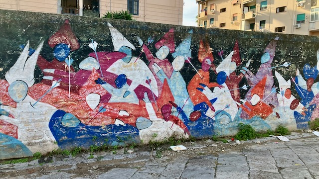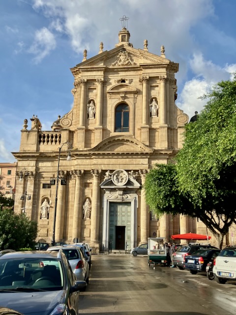 After our hour of soaking up the sun and breezes, we continued our walk around the large park there at the lungomare and then headed back to the apartment. Since we had seen two weddings and possibly a funeral service at the church about 100 yards from the apartment, we snapped a picture. It is huge and very tall, almost as big as some of the cathedrals we have visited. This is La Chiesa Santa Teresa alla Kalsa. Kalsa is one of the oldest historic neighborhoods in Palermo and we are staying. Kalsa comes from the Arabic “al-Khalisa” (“the chosen one”) from when the Arabs ran this neighborhood. An emir apparently lived in and ruled from this area.